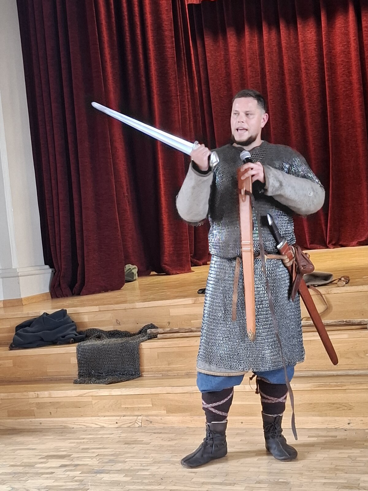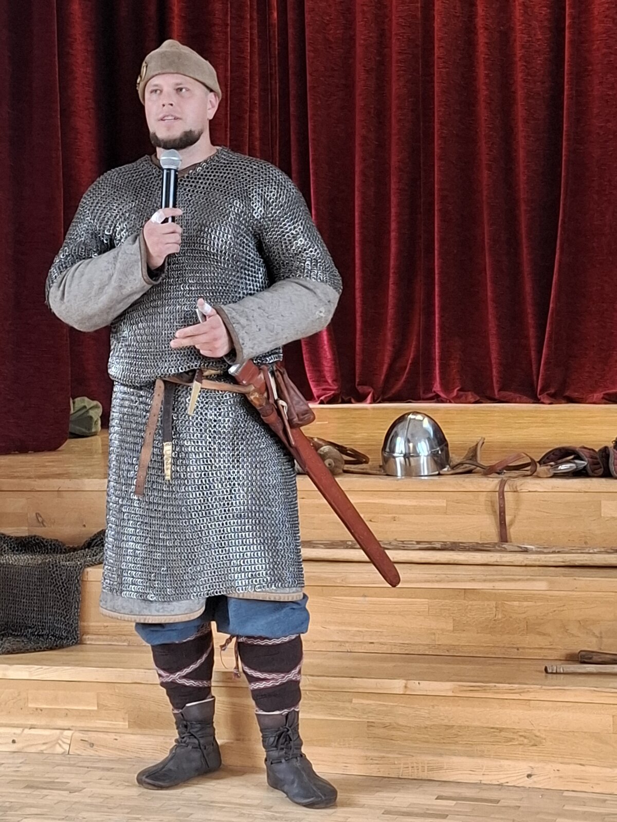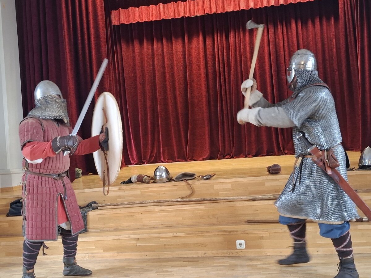 Šį pirmadienį sulaukėme dar dviejų svečių – buvusių gimnazijos mokinių, dabar istorijos rekonstruktorių: Martyno Švedo, dalyvaujančio vyrų karo dainų ansamblyje „Ugniavija“, užsiimančio senoviniais odos amatais ir jo buvusio klasioko Karolio Lukoševičiaus,. Martynas ne tik pasakojo apie baltų karybą, bet ir pademonstravo savo paties atkurtus senovinius ginklus. Svečiai surengė įspūdingą pasirodymą – kovas su įvairiais istoriniais ginklais, kurios mokinius nukėlė į praeitį ir leido pajusti baltų karių dvasią..