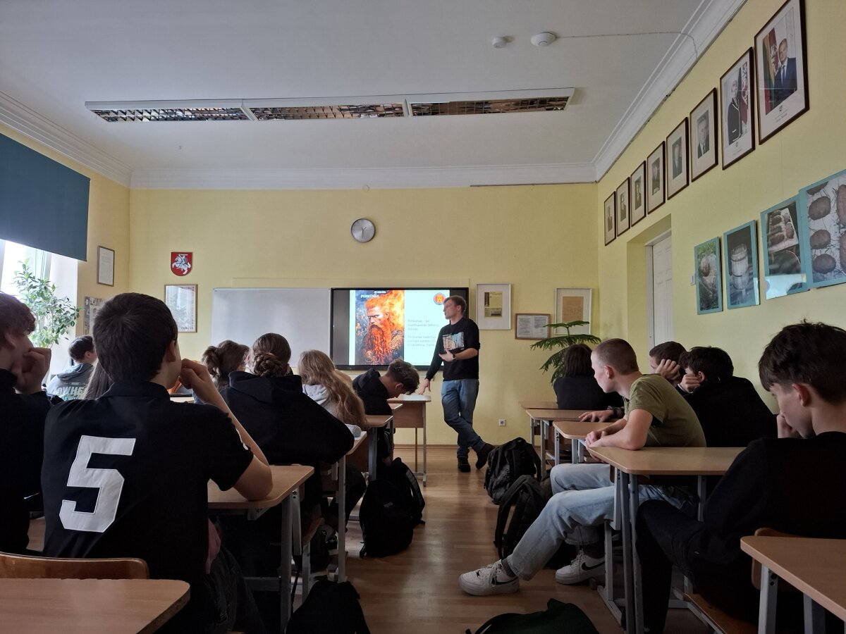 Praėjusį pirmadienį gimnazijoje lankėsi Vilniaus valstybinio pilių rezervato edukatorius Marijus Mažūnas, kuris su mokiniais dalijosi žiniomis apie baltų kultūrą ir religiją. Jo pasakojimai atskleidė, kaip mūsų protėviai garbino gamtą, kokios buvo jų vertybės ir kaip šios tradicijos išliko iki šių dienų. Mokiniai sužinojo apie baltų simboliką, papročius ir jų reikšmę formuojant mūsų tapatybę.