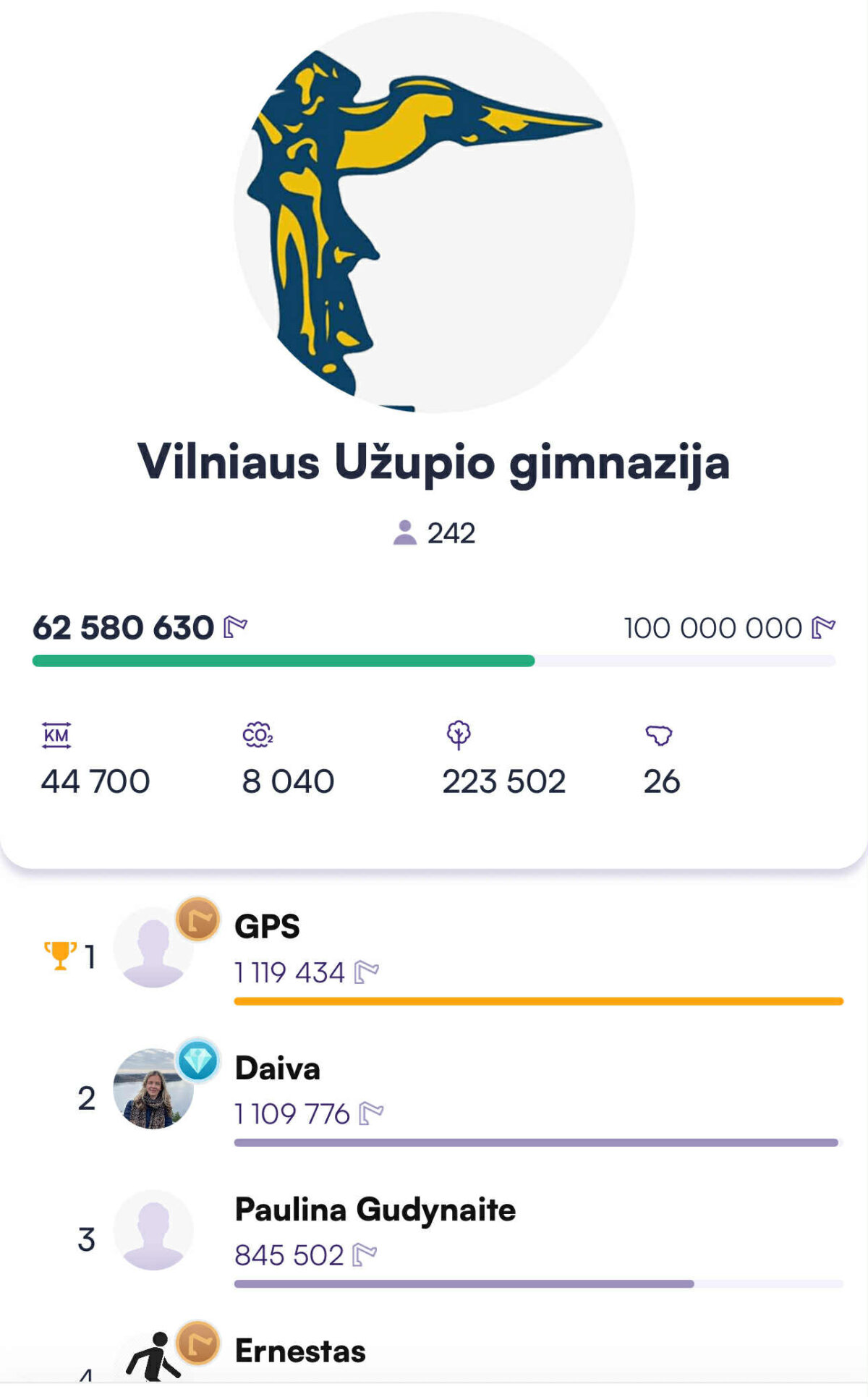 Kaip gi sekėsi mūsų gimnazijos komandai. Viso iššūkyje dalyvavo 854 Vilniaus ugdymo įstaigos. Mūsų gimnazijos komanda užėmė 68 vietą. Aktyviai rinko žingsnius net 242 bendruomenės nariai, kurių tarpe buvo ne tik gimnazistai, bet ir jų tėveliai bei mokytojai. Viso surinkome 62 580 630 žingsnių. 65 iššūkio dalyviai pasiekė asmeninį rekordą, surinkdami 400 000 ir daugiau žingsnių, ir gavo specialų iššūkio diplomą. 2D klasės mokinė Gabija Paužaitė surinko 1 119 434 žingsnius, 2E klasės mokinė Paulina Gudynaitė – 845 502 žingsnius. Šeši dalyviai, tarp kurių fizinio ugdymo mokytoja Rasa ir IT mokytojas Andrius, surinko virš 600 000 žingsnių.